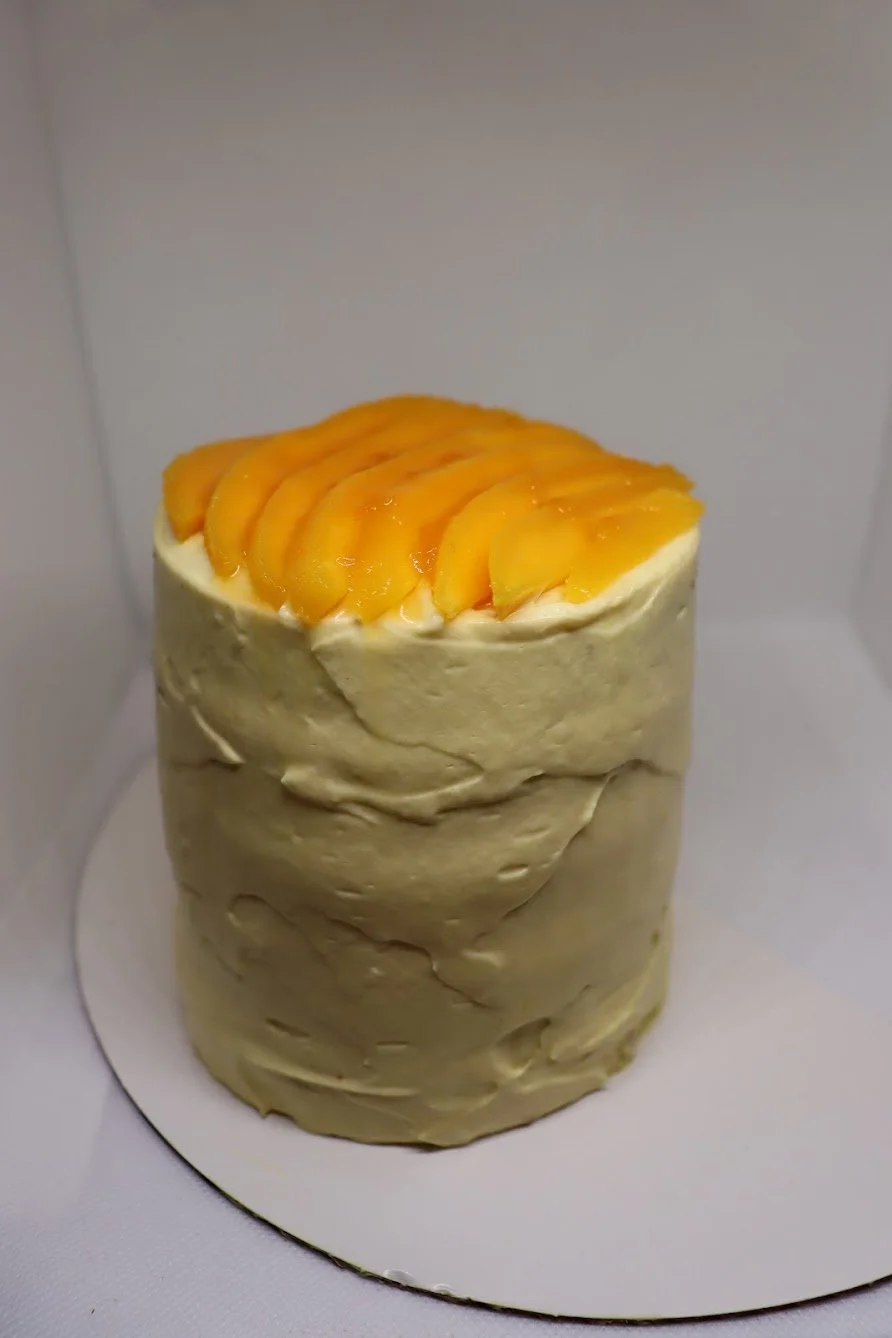 Vanilla cake, homemade mango cream frosting, and filled with fresh mangos