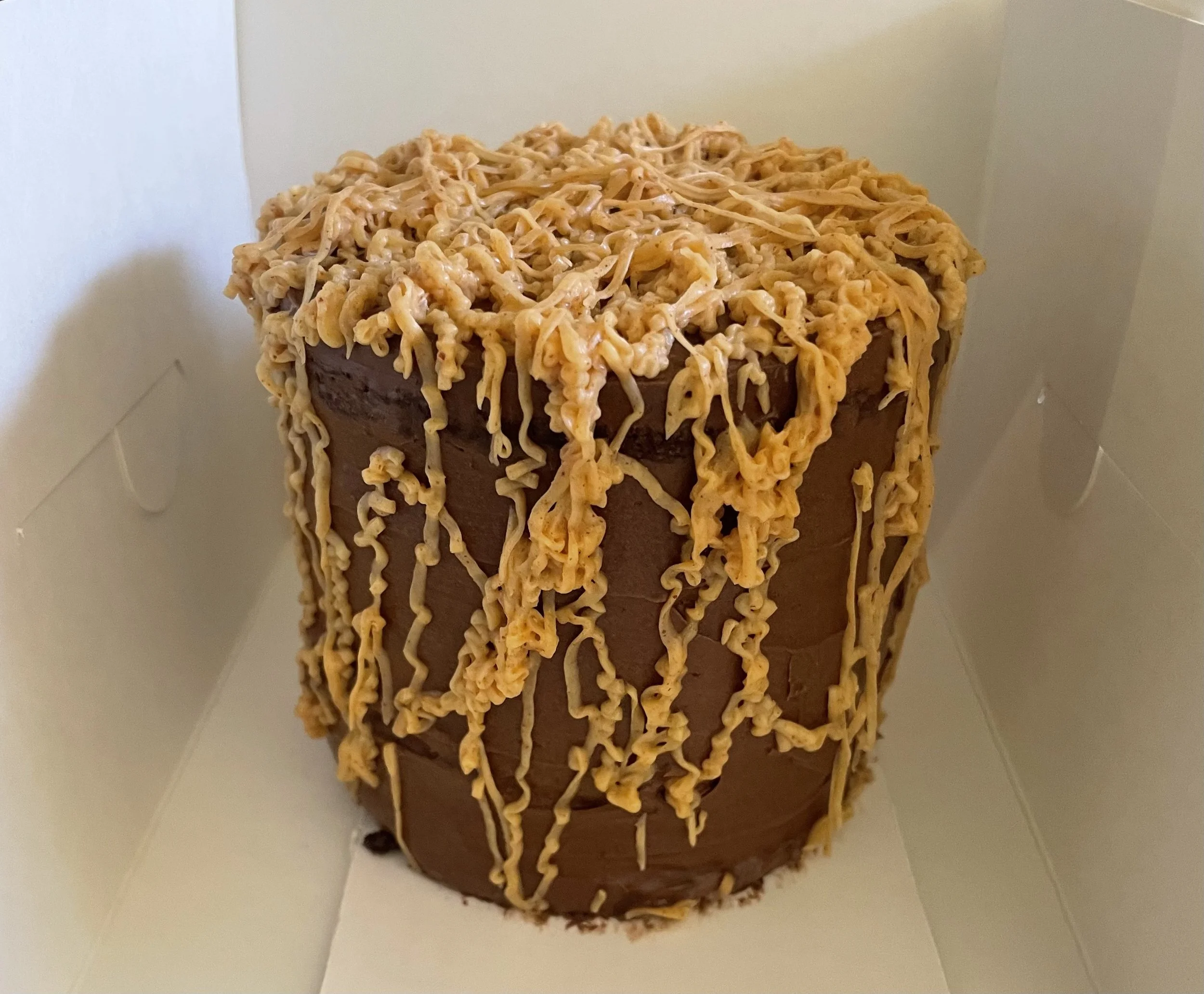 Chocolate cake, peanut butter ganache, chocolate ganache with a milk chocolate frosting